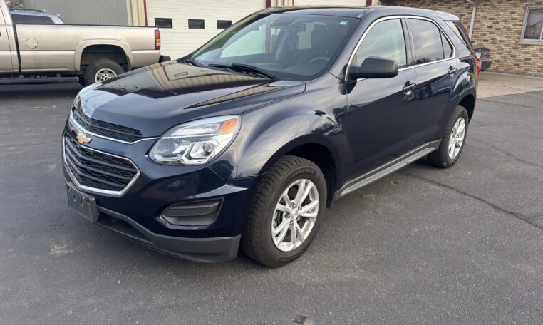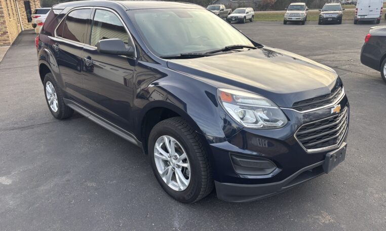 This 2017 Chevrolet Equinox LS AWD is a clean, budget-friendly compact SUV with all-wheel drive, a fuel-efficient 2.4L engine, and seating for five. Finished in Old Blue Eyes Metallic with Jet Black cloth, it offers a comfortable ride, good interior space, and simple, easy-to-use features.