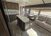 The main living area includes an island kitchen, panoramic rear windows, freestanding dinette, dual reclining theater seating, and a tri-fold sleeper sofa. The entertainment center features a large TV and electric fireplace.