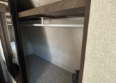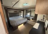 The private king-bed suite offers a mirrored wardrobe, dresser, and generous overhead storage. The Lippert Ground Control Auto-Leveling System, Polar Package+, power tongue jack, and rear cargo rack make campsite setup simple.
