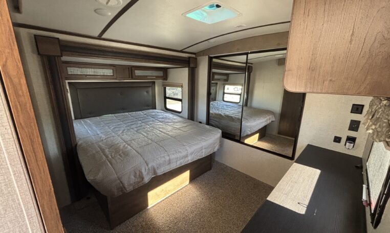 The private king-bed suite offers a mirrored wardrobe, dresser, and generous overhead storage. The Lippert Ground Control Auto-Leveling System, Polar Package+, power tongue jack, and rear cargo rack make campsite setup simple.