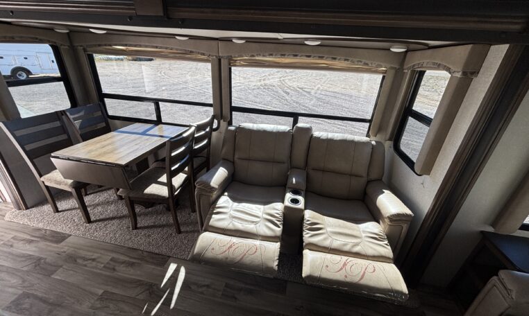 The main living area includes an island kitchen, panoramic rear windows, freestanding dinette, dual reclining theater seating, and a tri-fold sleeper sofa. The entertainment center features a large TV and electric fireplace.