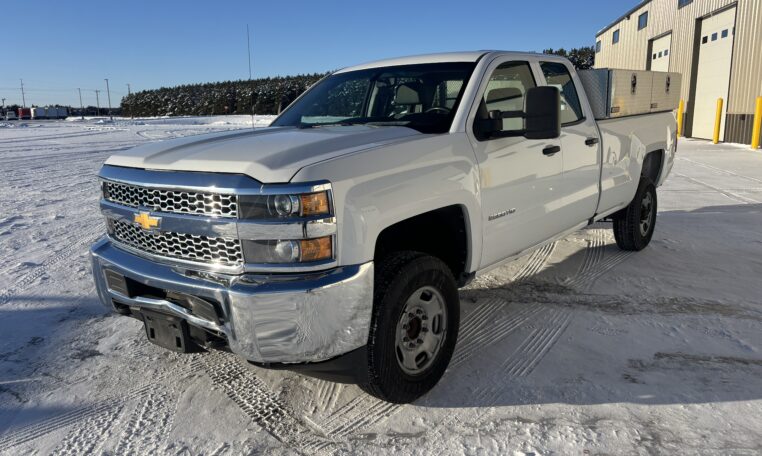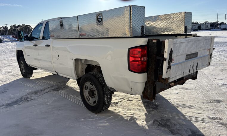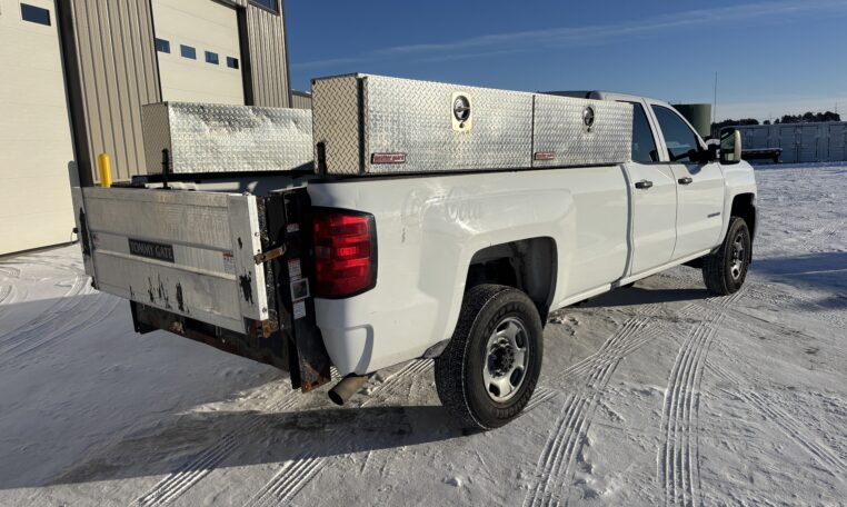 This 2019 Chevrolet Silverado 2500HD WT is a work truck equipped with the 6.0L Vortec V8, 6L90 heavy-duty automatic transmission, 4.10 locking rear differential, and the factory Z82 trailering package. It features an extended cab with a long box, dual Weather Guard toolboxes, and a Tommy Gate hydraulic lift rated for 1,500 lbs. The truck includes power windows and locks, cruise control, a backup camera, and durable vinyl flooring. A solid commercial-use truck suitable for construction, delivery, agriculture, and service operations.