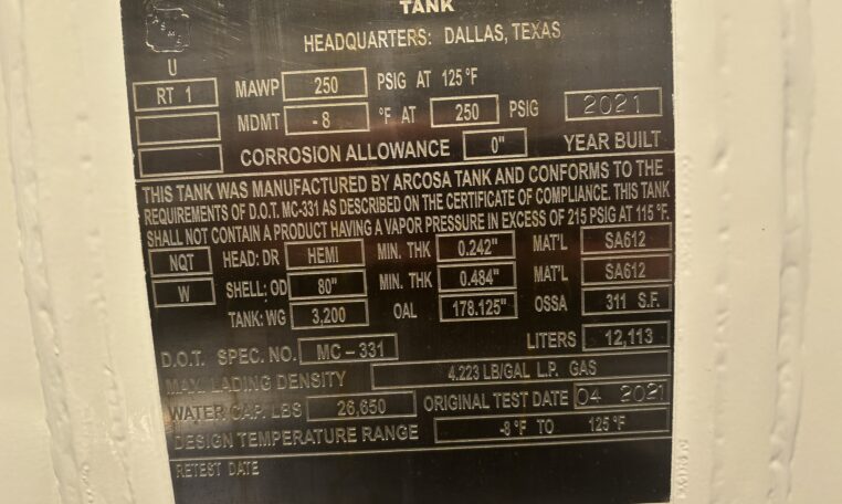 - 3,200 Gallon Arcosa MC-331 Propane Tank